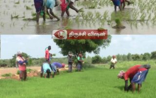 திருச்சியில் வயலில் நாற்று நட்ட வடமாநில தொழிலாளர்கள்.