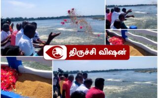முக்கொம்பில் காவிரி நீரை வரவேற்ற விவசாயிகள்