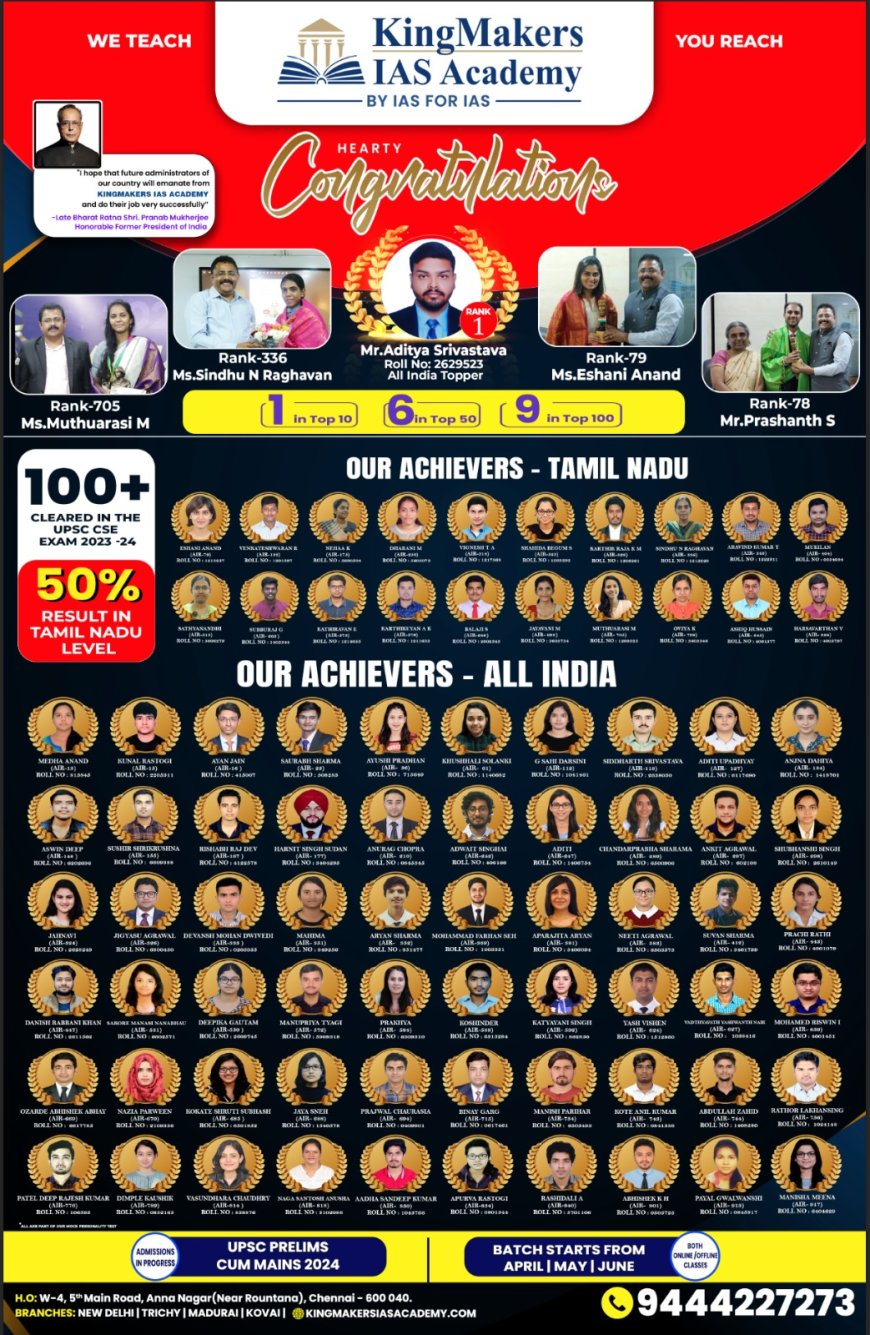 அகில இந்திய குடிமைப்பணித் தேர்வு முடிவுகள் மத்திய குடிமை பணி தேர்வு ஆணையத்தால் ஏப்ரல் 16 அன்று (16.04.24) வெளியிடப்பட்டுள்ளது. ஐ.ஏ.எஸ், ஐ.பி.எஸ் போன்ற 21 பதவிகளுக்கு, மொத்தம் 1105 காலிப் பணியிடங்களை நிரப்புவதற்கான அறிவிப்பு மத்திய குடிமைப்பணி ஆணையத்தால் கடந்த ஆண்டு பிப்ரவரி (01.02.2023) அன்று வெளியிடப்பட்டது. முதனிலைத் தேர்வு, முதன்மைத் தேர்வு, நேர்காணல் என மொத்தம் மூன்று கட்டங்களாக நடைபெற்ற தேர்வின் முடிவுகள் தற்போது அறிவிக்கப்பட்டுள்ளன தொடர்ந்து இரண்டாவது ஆண்டாக கிங்மேக்கர்ஸ் ஐஏஎஸ் அகாடடெமி மாணவர் இந்திய அளவில் முதலிடம்.