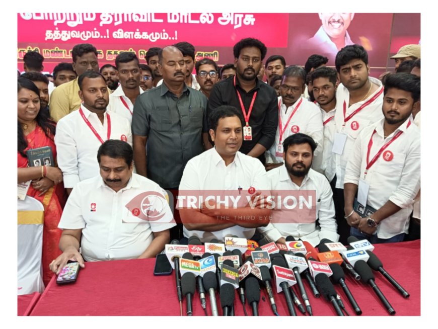 திருச்சி சத்திரம் பேருந்து நிலையம் அருகே உள்ள கலைஞர் அறிவாலயத்தில திமுக மண்டல தொழில்நுட்ப அணி ஆலோசனை மற்றும் ஆய்வு கூட்டம் நடைபெற்றது. இந்த கூட்டத்திற்கு தமிழ்நாடு பள்ளி கல்வித்துறை அமைச்சர் அன்பில் மகேஷ் மற்றும் தமிழ்நாடு தொழில்துறை அமைச்சர் டி.ஆர்.பி. ராஜா தலைமை தாங்கினார்கள்.