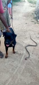 பாம்பு வீட்டிற்குள் நுழைந்து விட்டது என கேட்ட பெரும்பாலும் அவருடைய மகன் மற்றும் மனைவி வீட்டிற்கு வந்து பார்த்தபோது பெருமாளின் செல்லப் பிராணியான முனி என்ற நாய் வீட்டுக்கு ஓடி சென்று அந்த பாம்பை பிடித்து கடித்து கொன்றது.