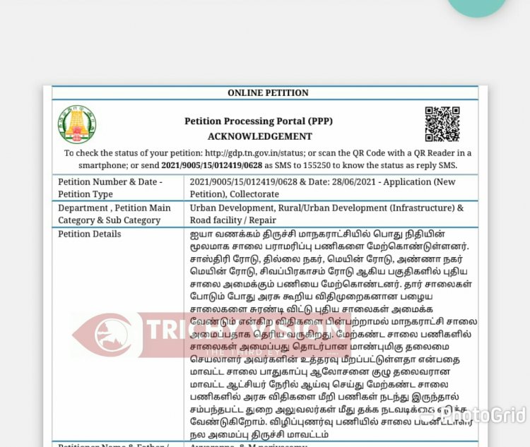 திருச்சி மாவட்ட சாலை பயனீட்டாளர் நல அமைப்பு சார்பில் நகர்புற மற்றும் ஊரக வளர்ச்சி துறைக்கு இணையதளம் மூலம் புகார் மனு அளிக்கப்பட்டு உள்ளது. இதில் திருச்சி மாநகராட்சியில் பொது நிதியின் மூலமாக சாலை பராமரிப்பு பணிகளை மேற்கொண்டுள்ளனர்.
